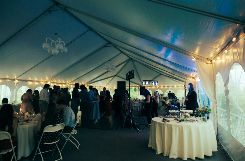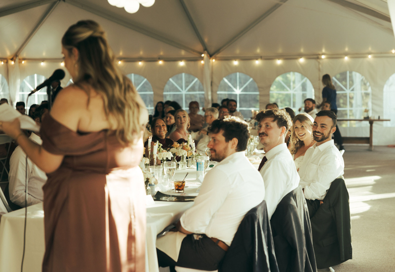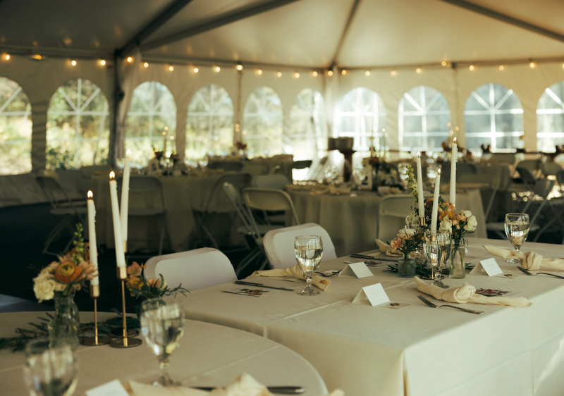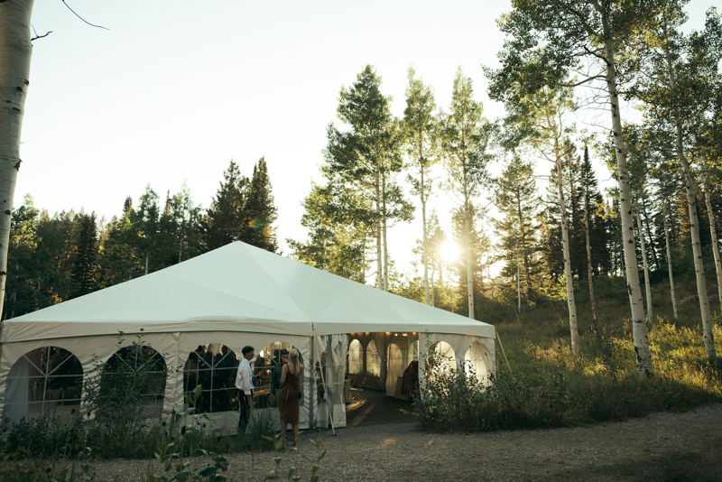 During summer, a large white tent is set up in the Targhee Forest near the main cabins. Couples will often use both the lawn and the tent for different parts of the day. This creates a semi-indoor reception space that still feels immersed in nature.